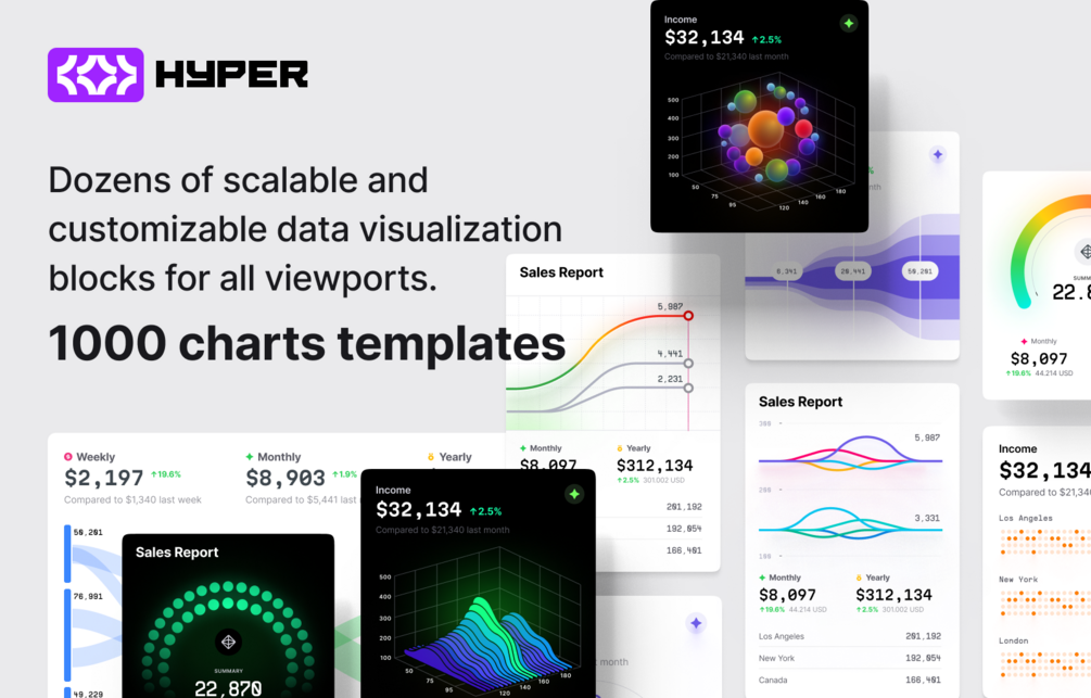 Hyper Charts includes over 1000 of editable graphs in blocks, making it easy to create stunning and professional-looking visualizations for any project. The graphs are fully customizable, so you can change the colors, fonts, and styles to match your brand or project theme. The kit also includes a variety of chart types, so you can find the ideal graph to match your data.