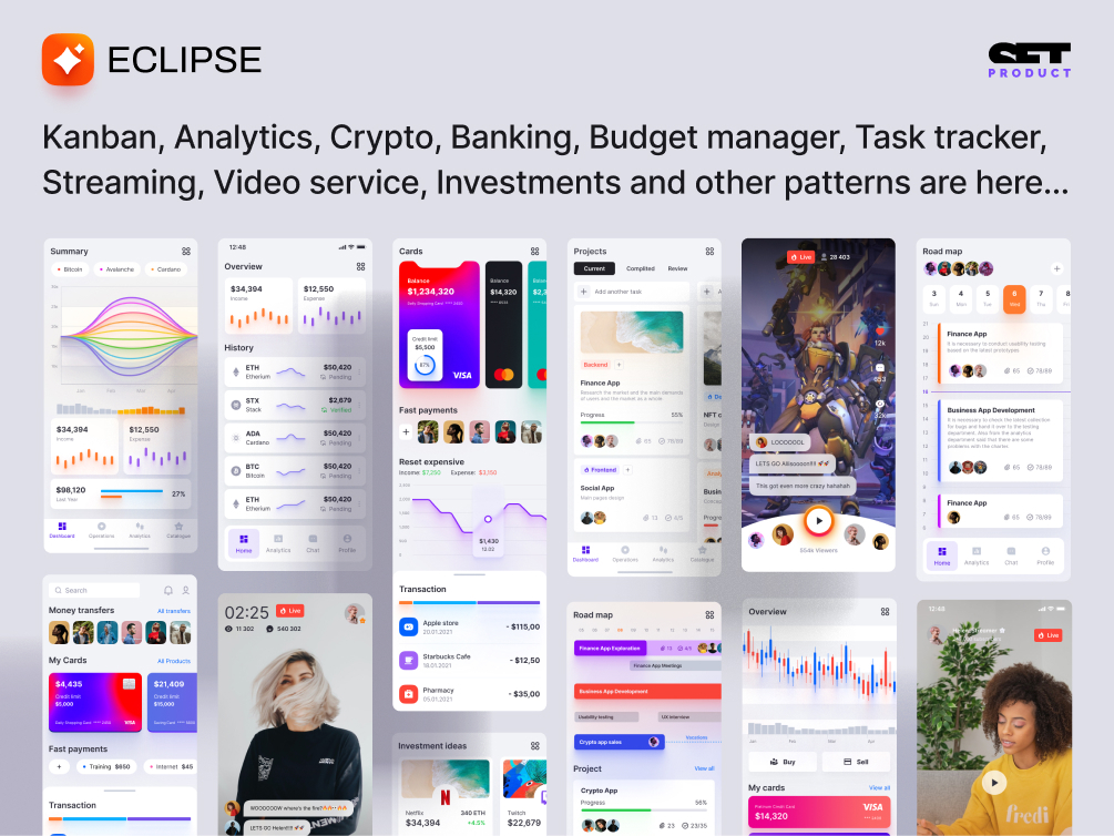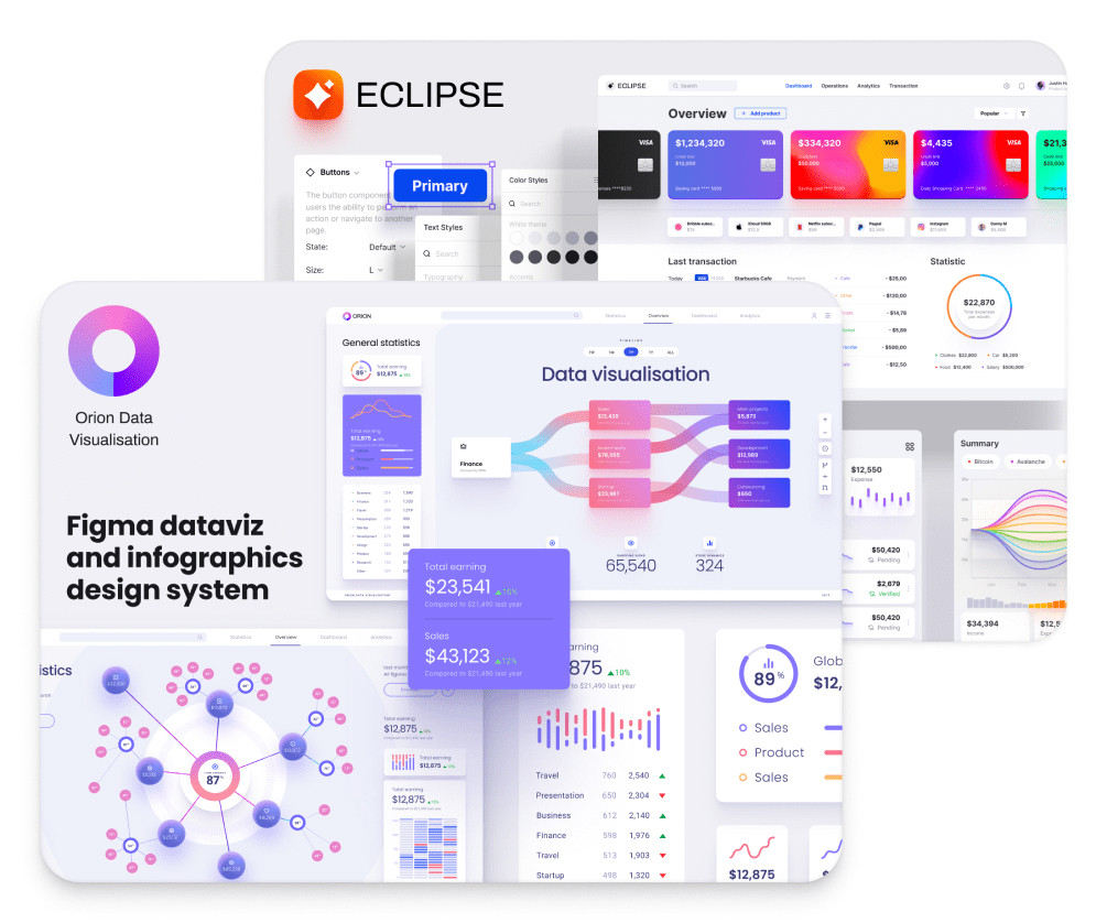 Orion data visualization and charts kit + Eclipse UI kit bundle from Setproduct. Create clear & usable web applications faster in Figma. We've got each component is covered to design and release a project faster! Save 30% by purchasing two design libraries together.