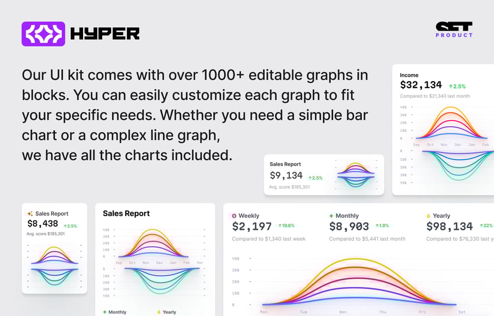 Create impressive visuals with Hyper Charts templates – dozens of scalable and customizable data visualization blocks for dark and light modes.