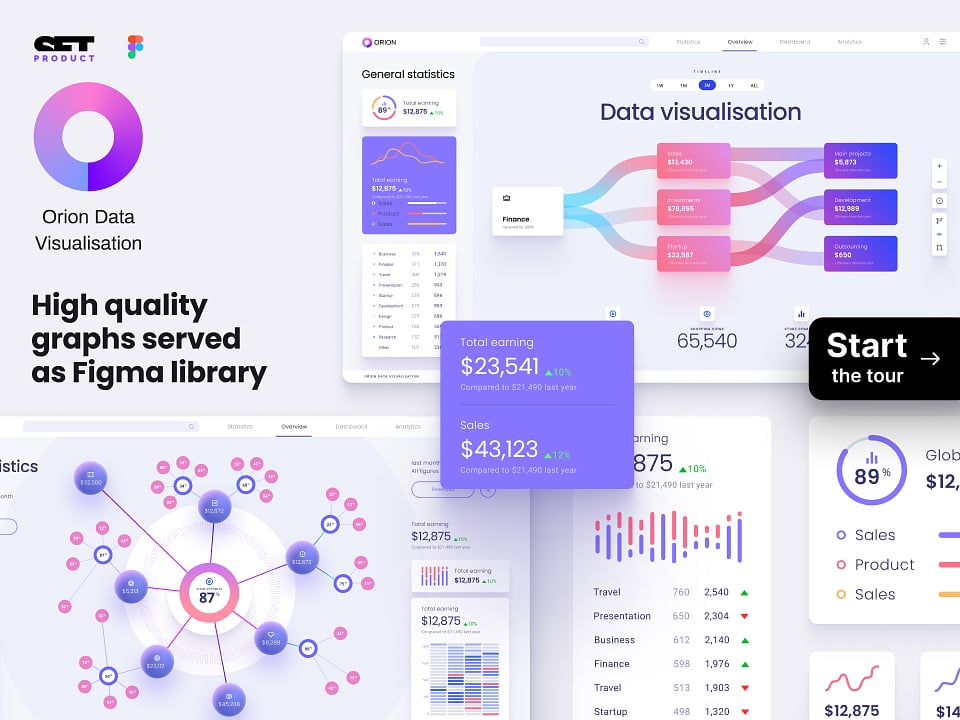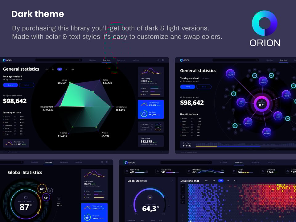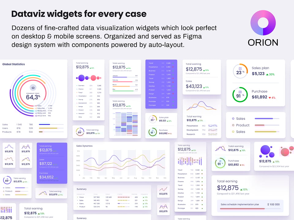 Orion UI kit - is a Figma library with 50+ full-width charts templates served in light & dark themes. Contains 200+ of dataviz widgets that look perfect on desktop & mobile screens. Organized as a design system for Figma and supported with 2500+ components based on auto-layout.